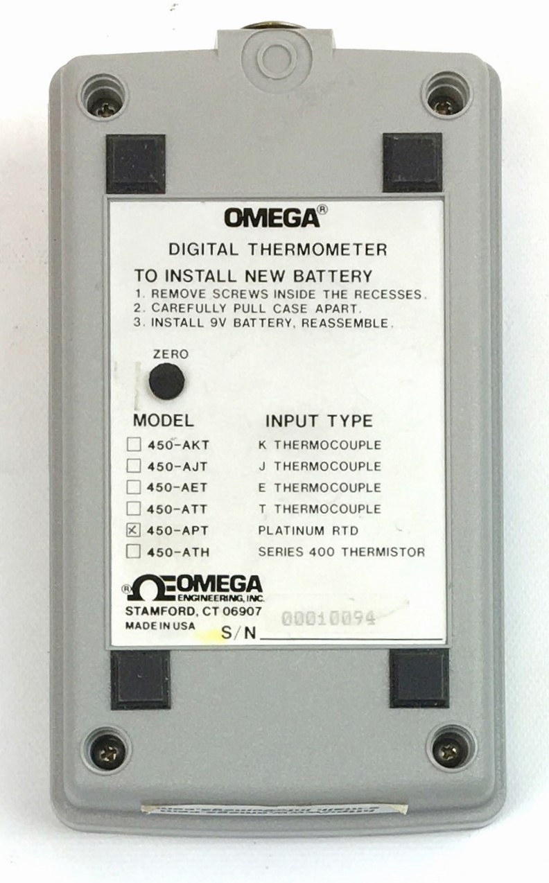 The Omega 450 APT digital thermometer is a hand-held, battery operated digital temperature indicators configured for compatibility with a platinum RTD transducer (NOT included). The unit linearizes the analog output from the transducer to produce a stable and accurate digital temperature display. Plug-in type input connectors are used for the transducer input to provide quick connect and disconnect capability. The indicator functions are controlled by the keyboard. The liquid crystal display exhibits the value of the measurement, degrees Fahrenheit or Celsius, and the low battery voltage indication.