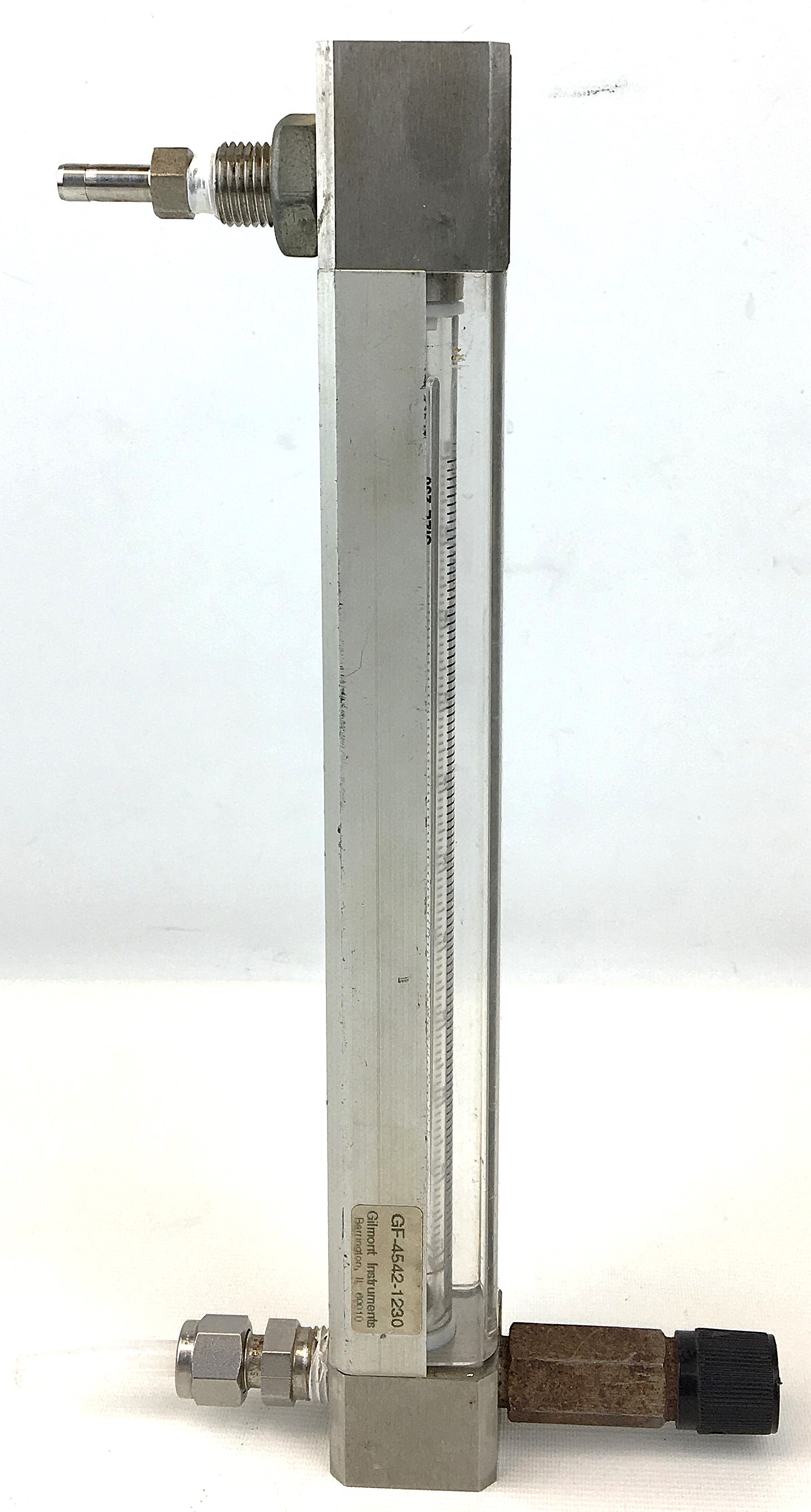 Gilmont 100mm direct-reading flow meters (size 230) have excellent chemical compatibility, with glass and PTFE construction. Flow meter measurements can be read directly off the flow meter. These flow meters have an accuracy of up to ±2%. They have extremely low pressure drops-ideal for procedures with critical pressure values. They can easily change between correlated and direct-reading scales depending on the application.